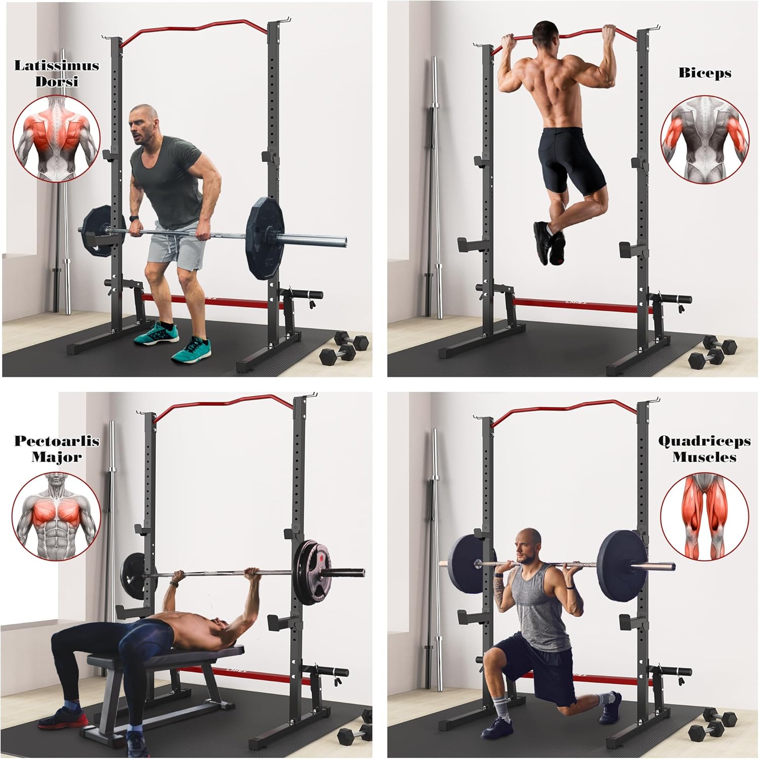 【GREAT FOR HOME GYM】The power rack is suitable for squat,bench press,shoulder press,curls,rowing,deadlift and many more exercises,an ideal equipment for personal training.It is very simple and convenient to assemble the squat rack even for beginners.