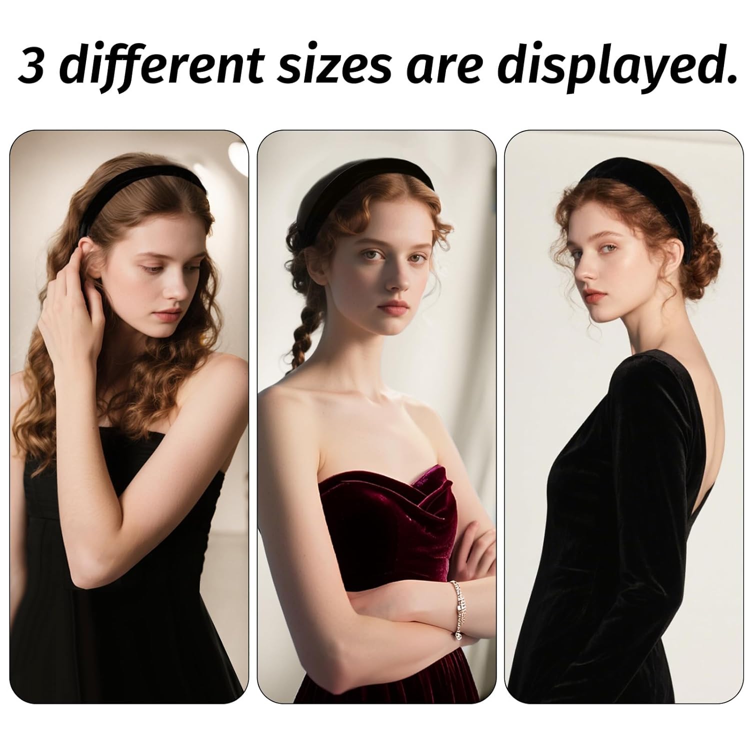 Great set of headbands that also fit larger heads. As a bigheaded woman, I’ve always struggled to find headbands that didn’t slip off or cause me headaches. These headbands stay in place, haven’t caused me any headaches, and come in three sizes/thicknesses. I love the smooth velvety feel of them too. They have a thick pillowy foam under the velvet cover. These are really nice and a great value. I will be buying more soon.
