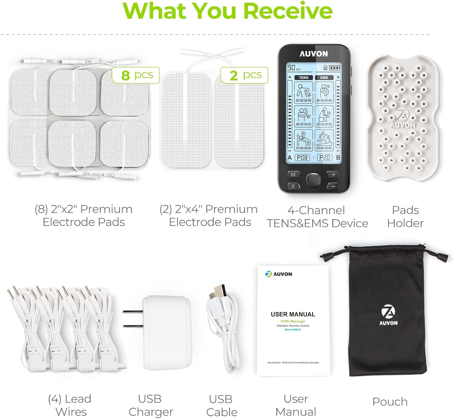 What You Receive: 1 x AUVON 4-Channel TENS and EMS Machine, 10pcs Electrode Pads (8pcs 2″ x 2″ Square Electrode Pads, 2pcs 2″ x 4″ Large Rectangle Pads), 4 x Lead Wires, 1 x USB cable, 1 x USB Charger, 1 x Pad Holder, 1 x Pouch, 1 x User Manual, our 24-Month Warranty and Technical Support, and Friendly Customer Service