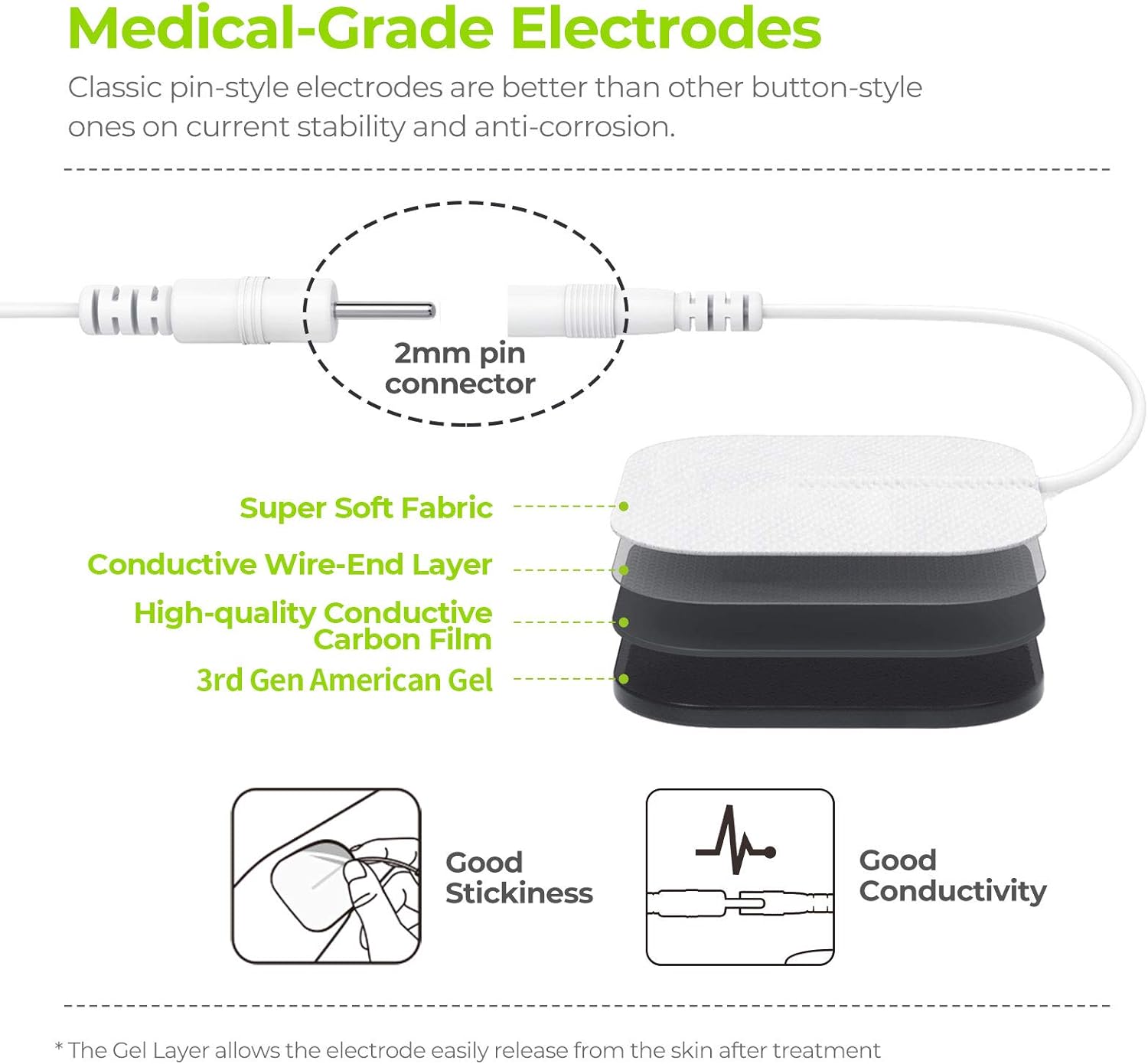 10 Upgraded TENS Unit Pads: The low-impedance solid gel has been upgraded to the industry-leading American adhesive, which can provide much better self-stick performance and easy clean-up after 45 uses for a longer lifespan. Standard 2mm connector lead wires and electrodes are classic and commonly used in the medical area, which makes it easier for you to find compatible accessories