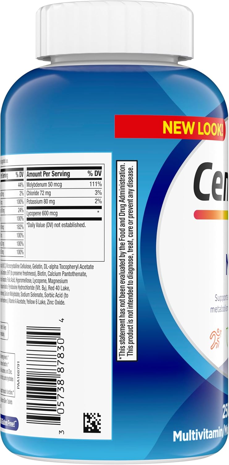 Centrum Multivitamin for Men is a complete multivitamin/multimineral supplement specially formulated for men. They are made with key micronutrients, including B Vitamins to help support energy levels and assist the body’s metabolism of macronutrients, antioxidants (2) for immune support, Vitamin B6 and Vitamin D3 to help support muscle function (1). These men’s multivitamin tablets are Non-GMO (3) and gluten free. The men’s multivitamin has a coating that makes them easy to swallow. The bottle of 250 vitamin supplements lasts about four months, complete from A to zinc. Take one multipurpose vitamin for men daily with food to provide vitamins and minerals for energy, metabolism and immune support (1). Help support wellness with Centrum, the number 1 doctor and pharmacist recommended brand. (1) These statements have not been evaluated by the Food and Drug Administration. This product is not intended to diagnose, treat, cure or prevent any disease. (2) Refers to Vitamins C, E and Beta-Carotene, and Zinc (3) Non-GMO applies to Centrum and Centrum Silver tablets only; learn more at Centrum’s official website.