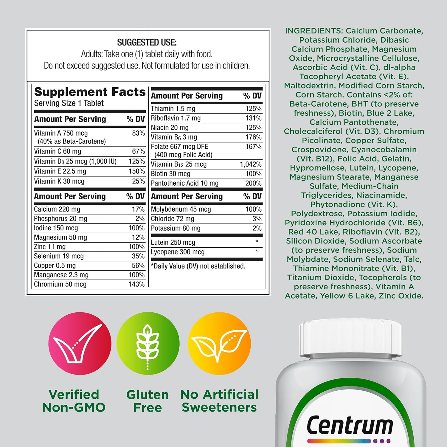 One 220 count bottle of Centrum Silver Multivitamin for Adults 50 Plus, Multivitamin/Multimineral Supplement with Vitamin D3, B Vitamins and Calcium