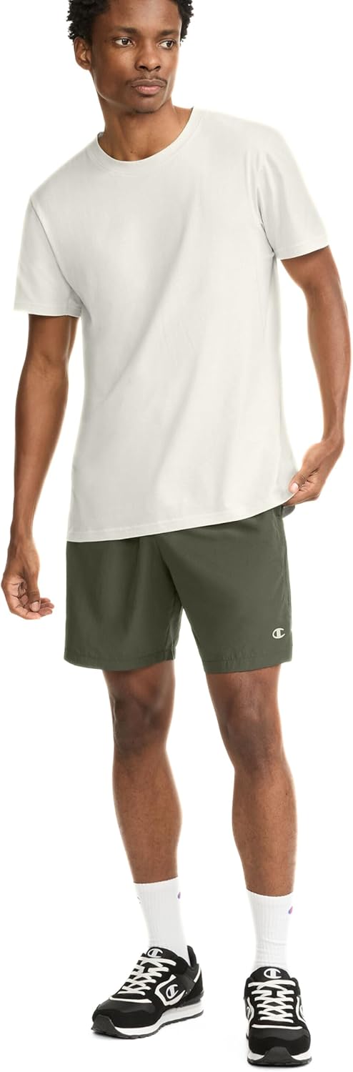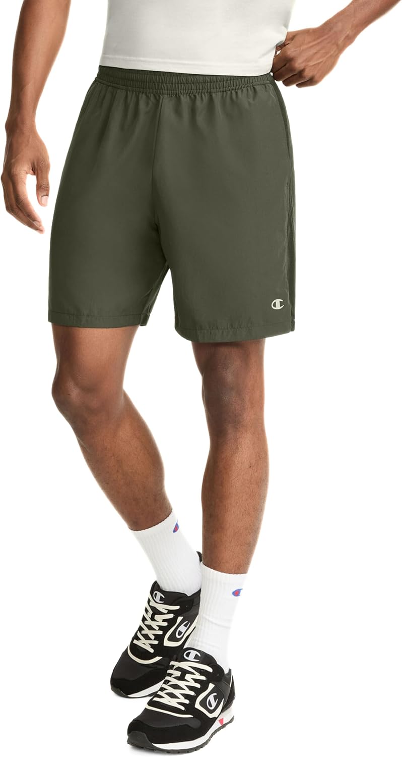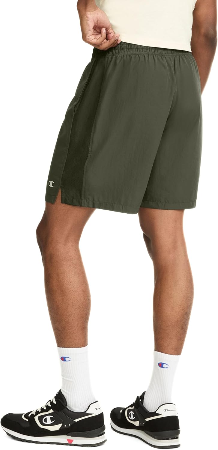 When you need super light, super easy, high performance gym shorts, Champion’s® unlined athletic shorts are a smart choice. Even during a sweaty workout or an intense pickup game, these woven training shorts wick moisture away from skin with Double Dry™ technology so you stay cooler and drier. Their mid-thigh length with a 7″ Inseam makes them an ultra-versatile silhouette, combining the best of short running shorts and long basketball shorts. Even better, they have airy mesh inset panels at the sides for extra ventilation, and side vents for maximum range of motion. You’ll welcome side-seam pockets and a comfortable inner drawstring to adjust the waist. Brand fans will appreciate the Champion “C” logo on the left leg. These lightweight performance shorts are the ultimate in reliable, all-purpose utility shorts.