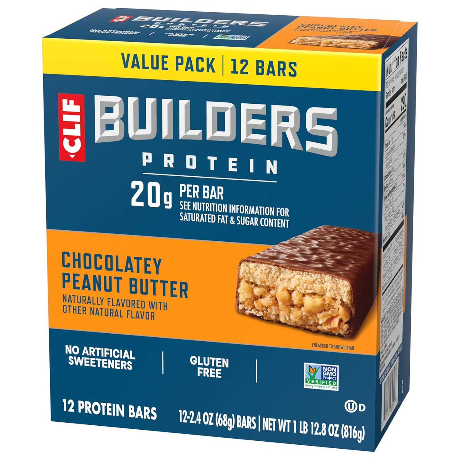 CLIF BUILDERS Chocolatey Peanut Butter Protein Bars are designed to help sustain hardworking bodies after tough workouts, whether at the gym, on the court, or on the track. High protein bars packed with 20 grams of plant based protein per bar* to help support, rebuild, and repair muscles, these gluten free protein bars work as hard as you do to help build something great. These CLIF BUILDERS bars with a deliciously classic chocolate peanut butter flavor help fuel recovery and get you ready for your next tough workout. Non-GMO Project Verified and low glycemic**, they contain no high-fructose corn syrup and no artificial sweeteners, making CLIF BUILDERS protein bars a powerful (and tasty) addition to your post-workout recovery regimen. *See nutrition information for saturated fat and sugar content. **Low-glycemic index foods digest slowly for prolonged levels of energy.