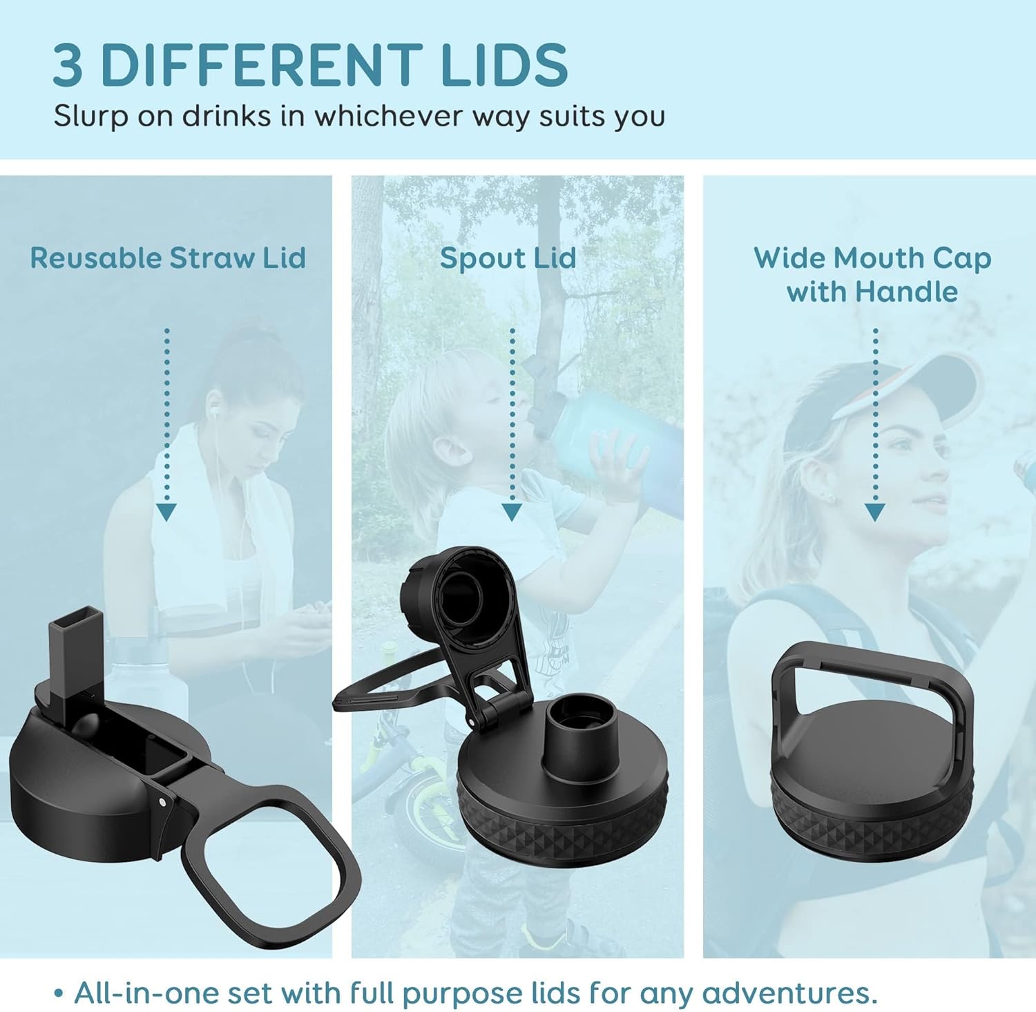 Flexible Drinking On-the-Go: This water jug comes with 3 different lids. The screw-on lid with flip-up handle is for easy ice refilling with superior portability; spout lid makes it convenient to drink hot liquid and straw lid for sipping cold.