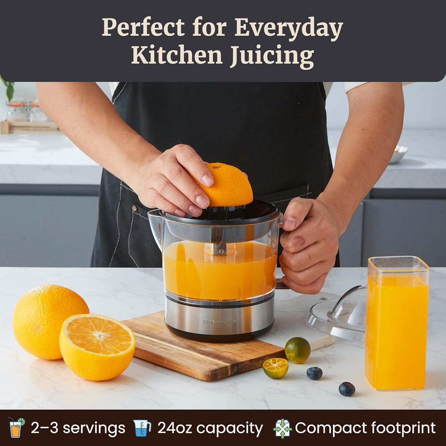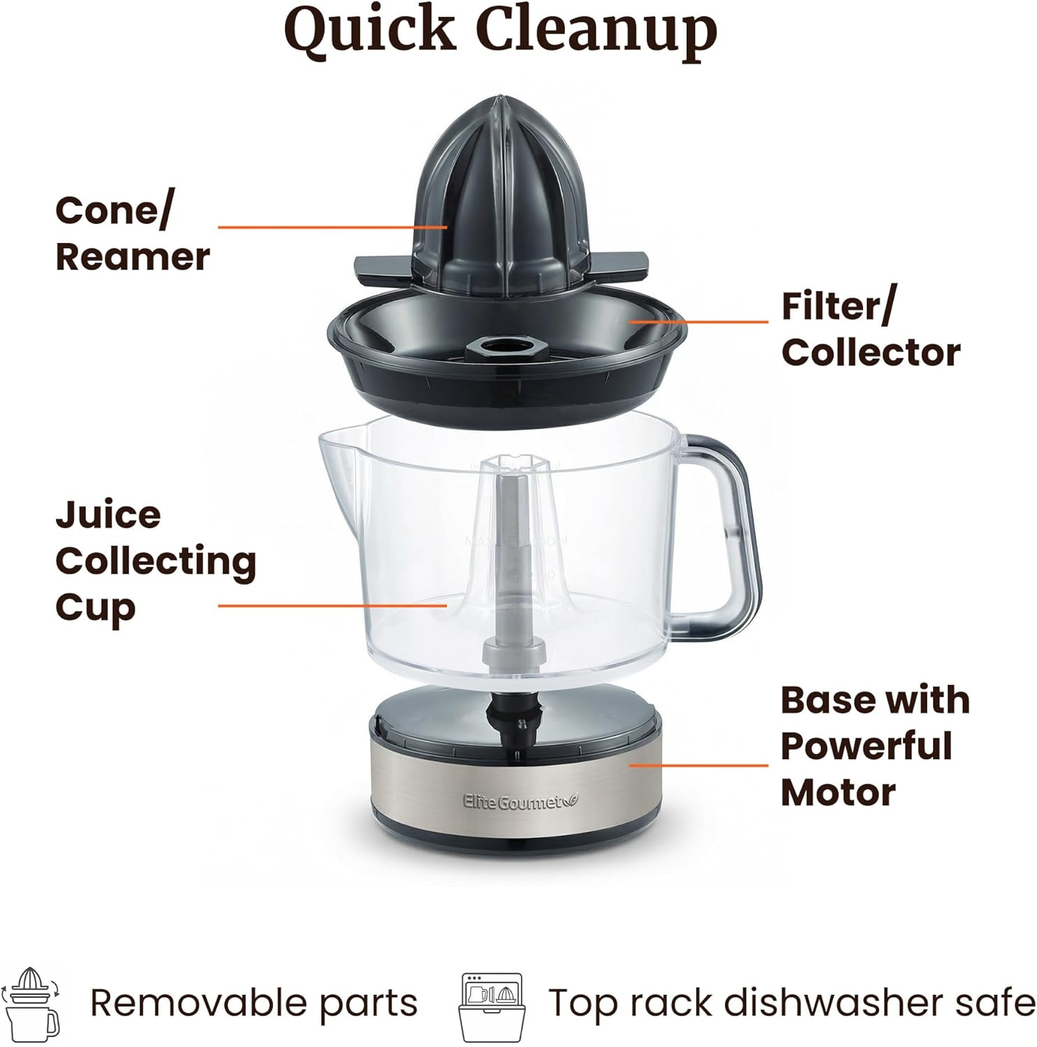 There is nothing quite like a tall glass of fresh squeezed OJ to get you going in the morning. The Elite Gourmet citrus juicer makes perfectly squeezed citrus juice by way of its pulp and seed strainer, making three cups of juice with just the right amount of pulp, without the seeds. Easy disassembly and cleaning makes this juicer a no fuss, no mess performer and operates at a conservative 40 watts.
