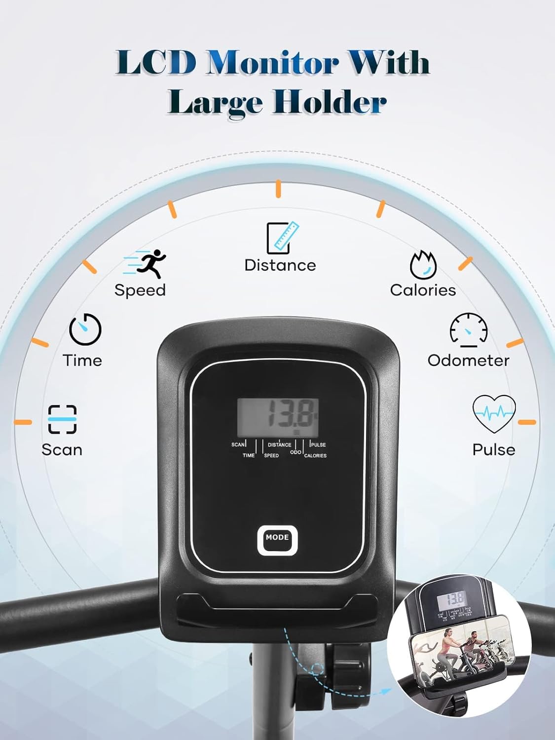 Functional LCD Monitor and Device Holder: The exercise bike can track your workout data in real-time: Time, Distance, Speed, Calories,Total distance and Pulse, make you stay focused on your workout goals. Device holder and mobile phone holder provide a great convenience for your cycling exercise. You can enjoy your movie or music at the same time. Best recumbent exercise bike for seniors or adults and whole family cardio workout