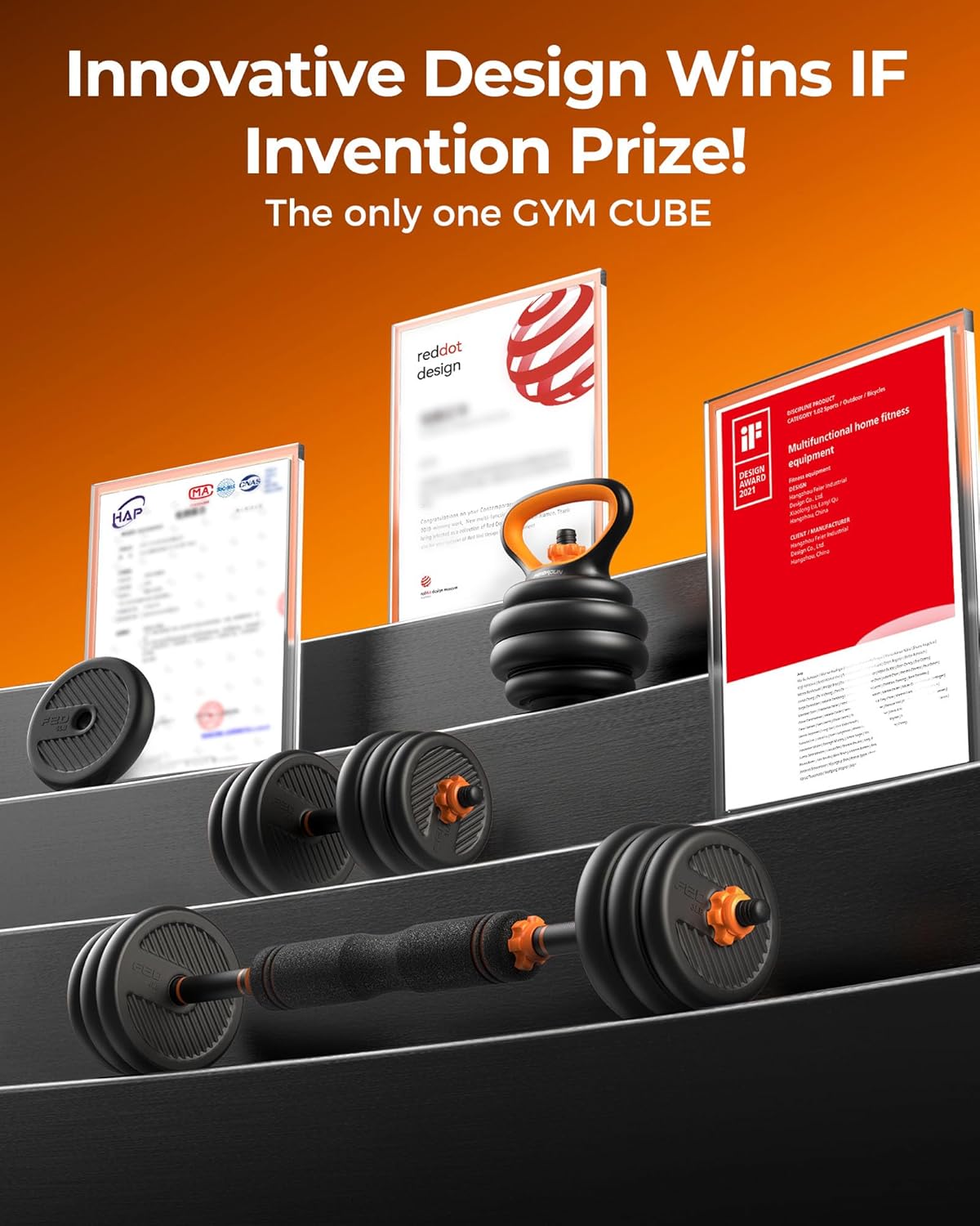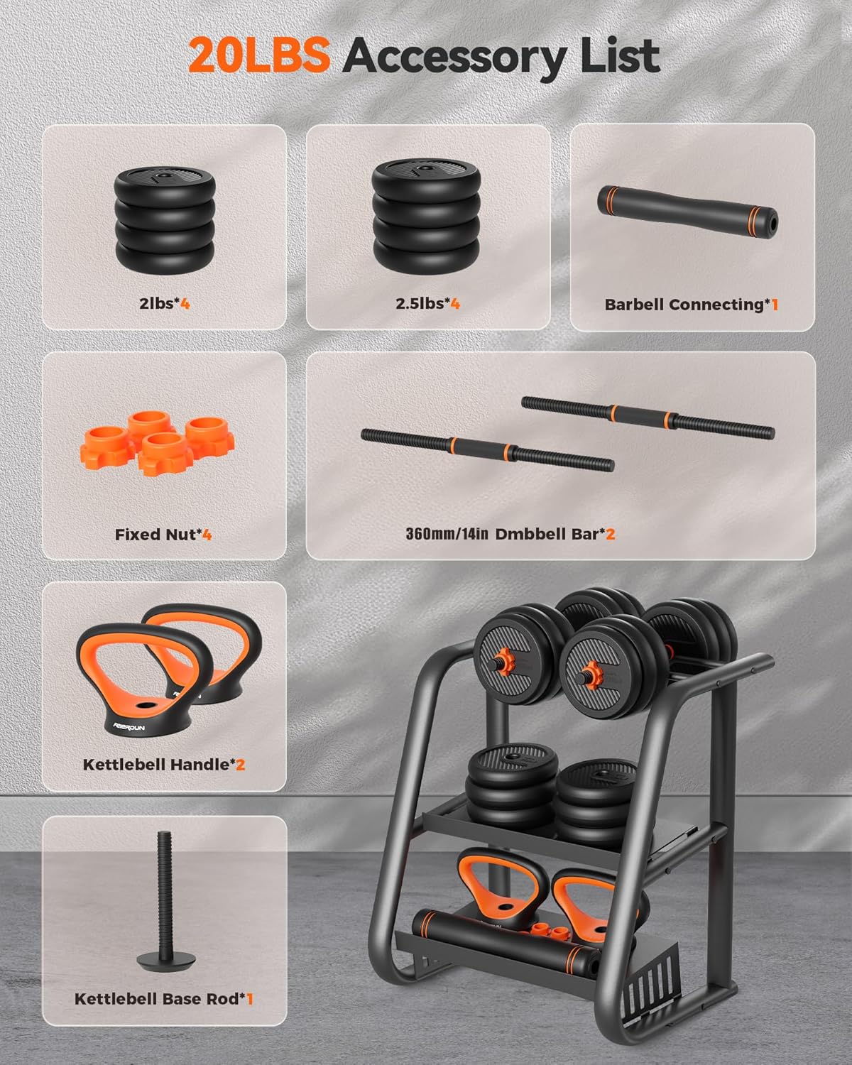 【5 in 1 Multifunctional Dumbbell Set】With it, you can get a pair of dumbbells also barbells, kettlebells, weight plate,and push-up stands, which help you do many exercises including bench presses, squats, etc.