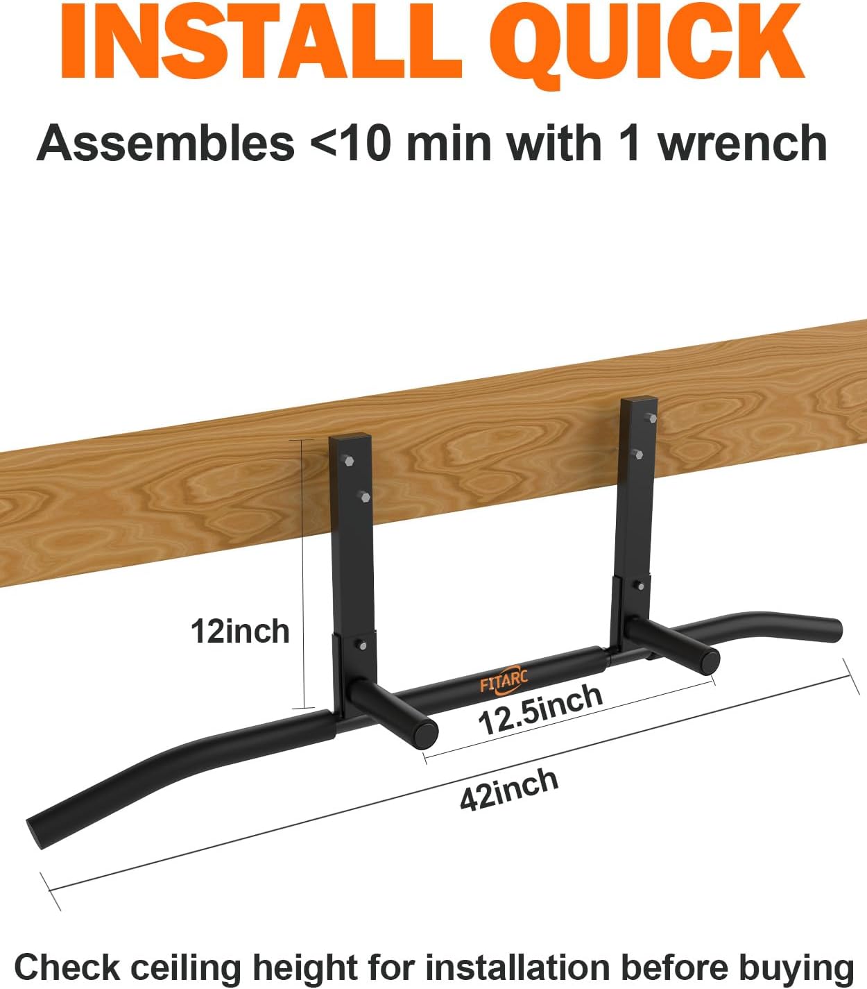 Iâm extremely impressed with the Fitarc Joist Mount Pull Up Bar. The steel construction feels solid and durable right out of the box, and once installed into ceiling joists, it feels incredibly secure. Thereâs no wobble or flex during pull-ups, chin-ups, or hanging leg raises, which really boosts confidence during workouts.The mounting hardware feels heavy duty, and the design distributes weight well across the joists. The grip width is comfortable and gives enough space for different hand positions, making it versatile for various upper-body exercises.Installation does require proper alignment with ceiling beams, but once mounted correctly, it feels very stable. The finish looks clean and professional, and it doesnât take up much visual space in a garage or home gym setup.Overall, this pull-up bar delivers exactly what you want in a ceiling-mounted unit: strength, stability, and reliability. Great value for a heavy-duty piece of equipment.
