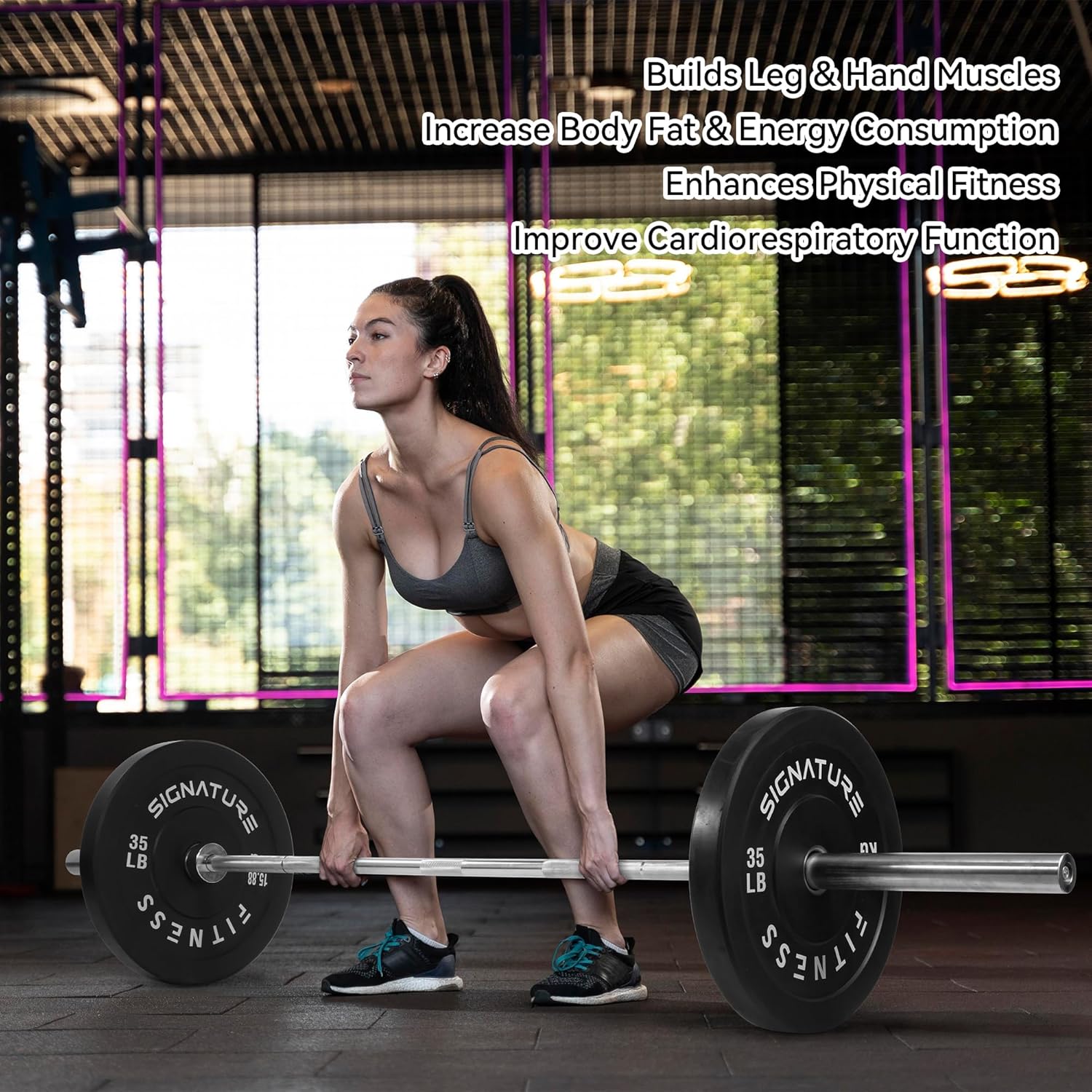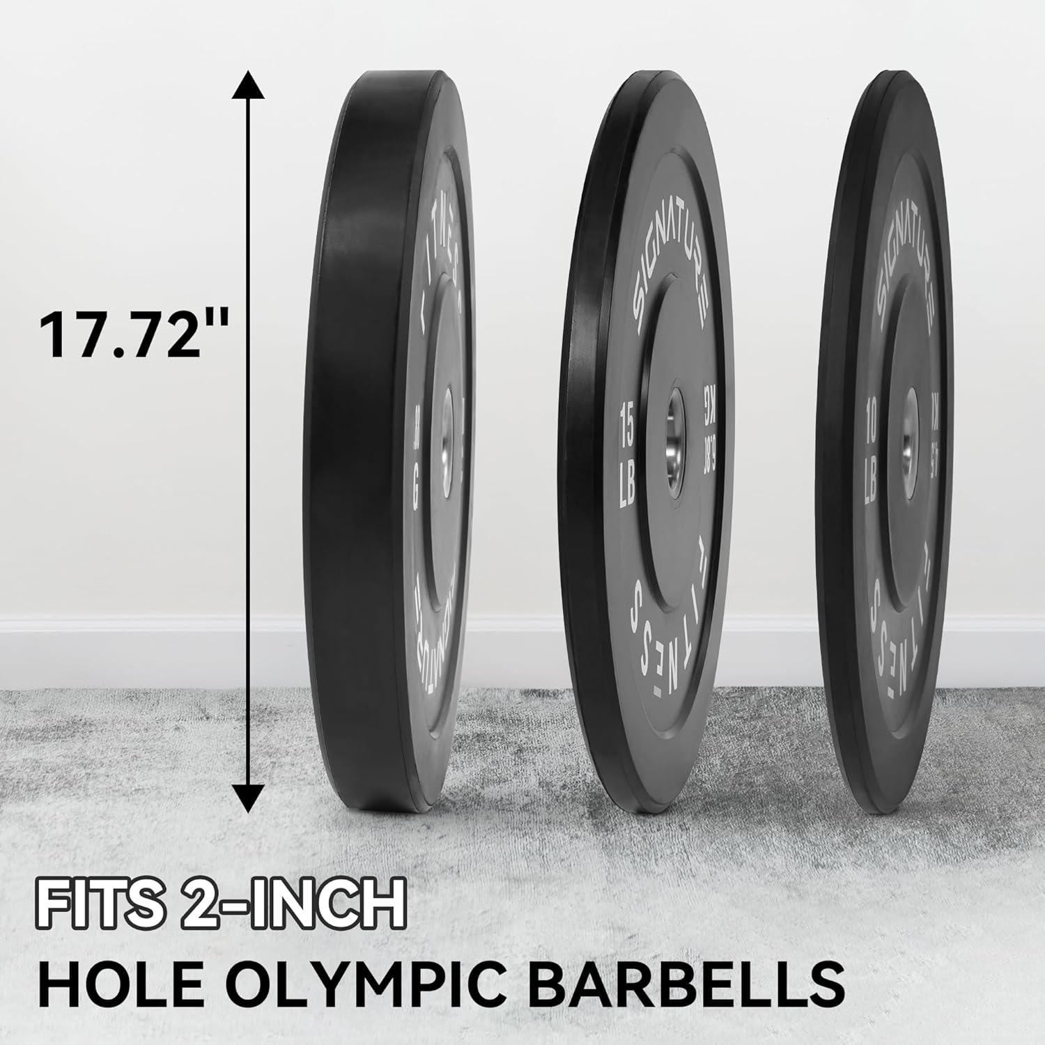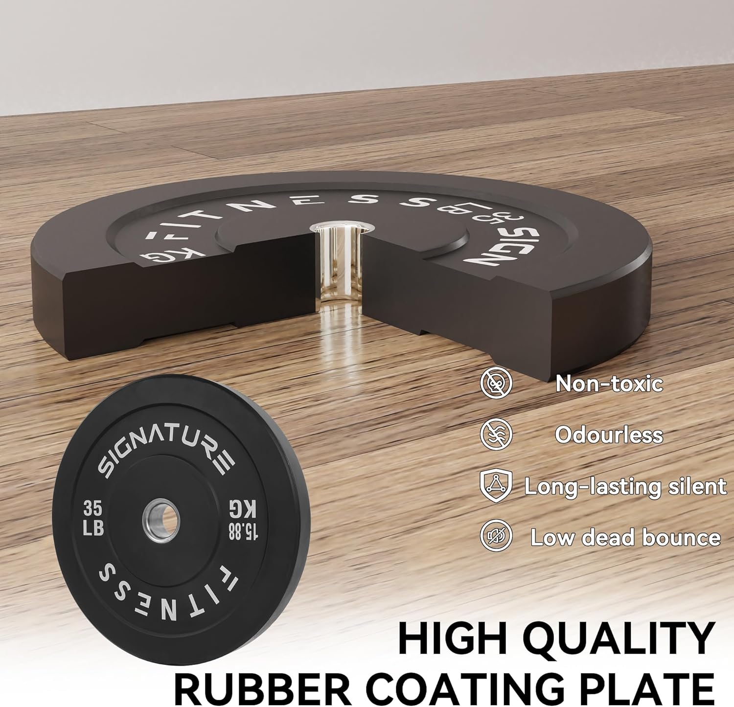 100% VIRGIN RUBBER – LOW ODOR AND BOUNCE – Signature Fitness Bumper Plates contain NO recycled rubber. This means low to no odor, guaranteed durability, and low “dead” bounce for safety.