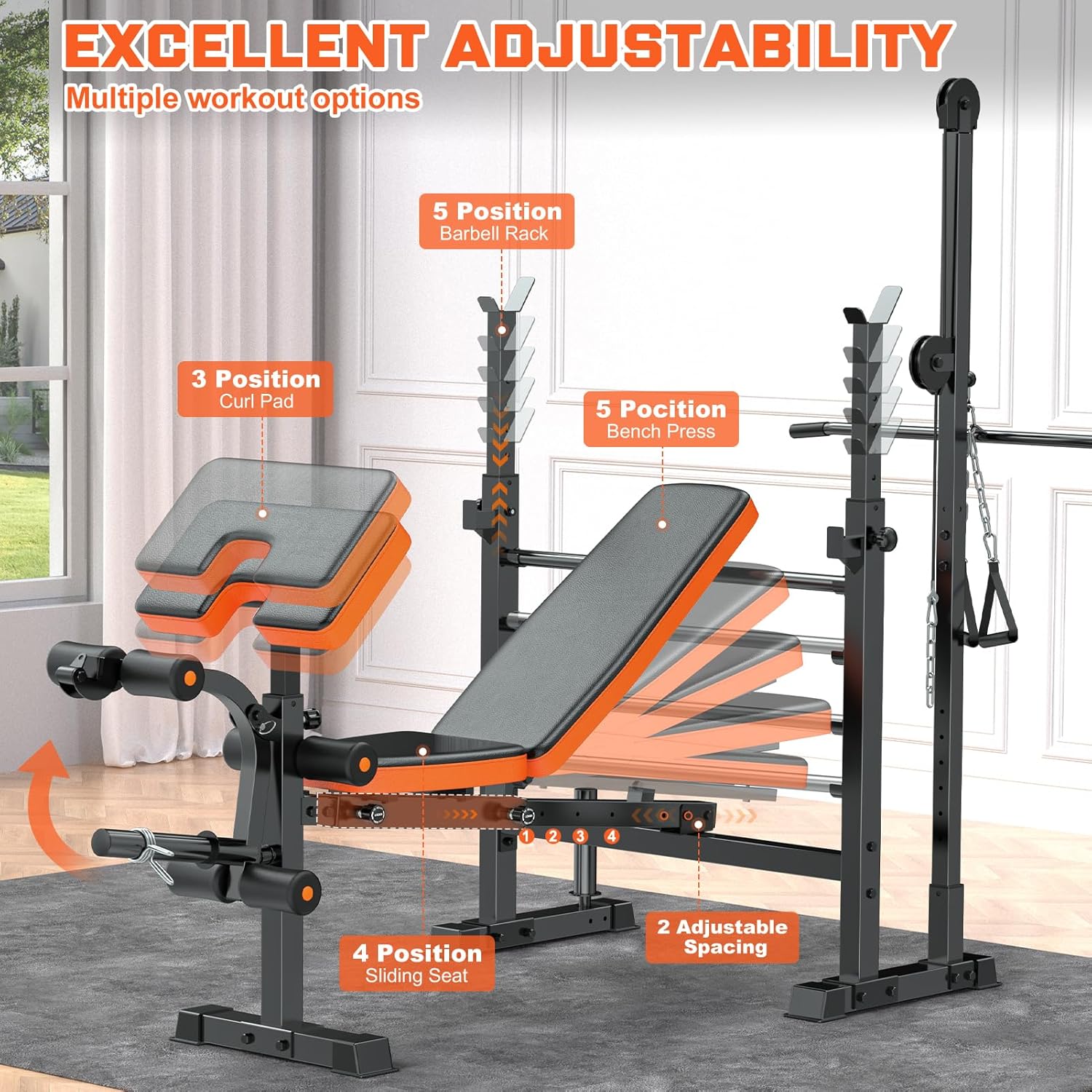 Fostoy 880lbs Weight Bench Set with LAT Pulldow, Bench Press Rack with Leg Extension/Curl and Preacher Curl, 8 in 1 Olympic Weight Benches for Home Gym Full-Body Adjustable Strength Training Equipment
