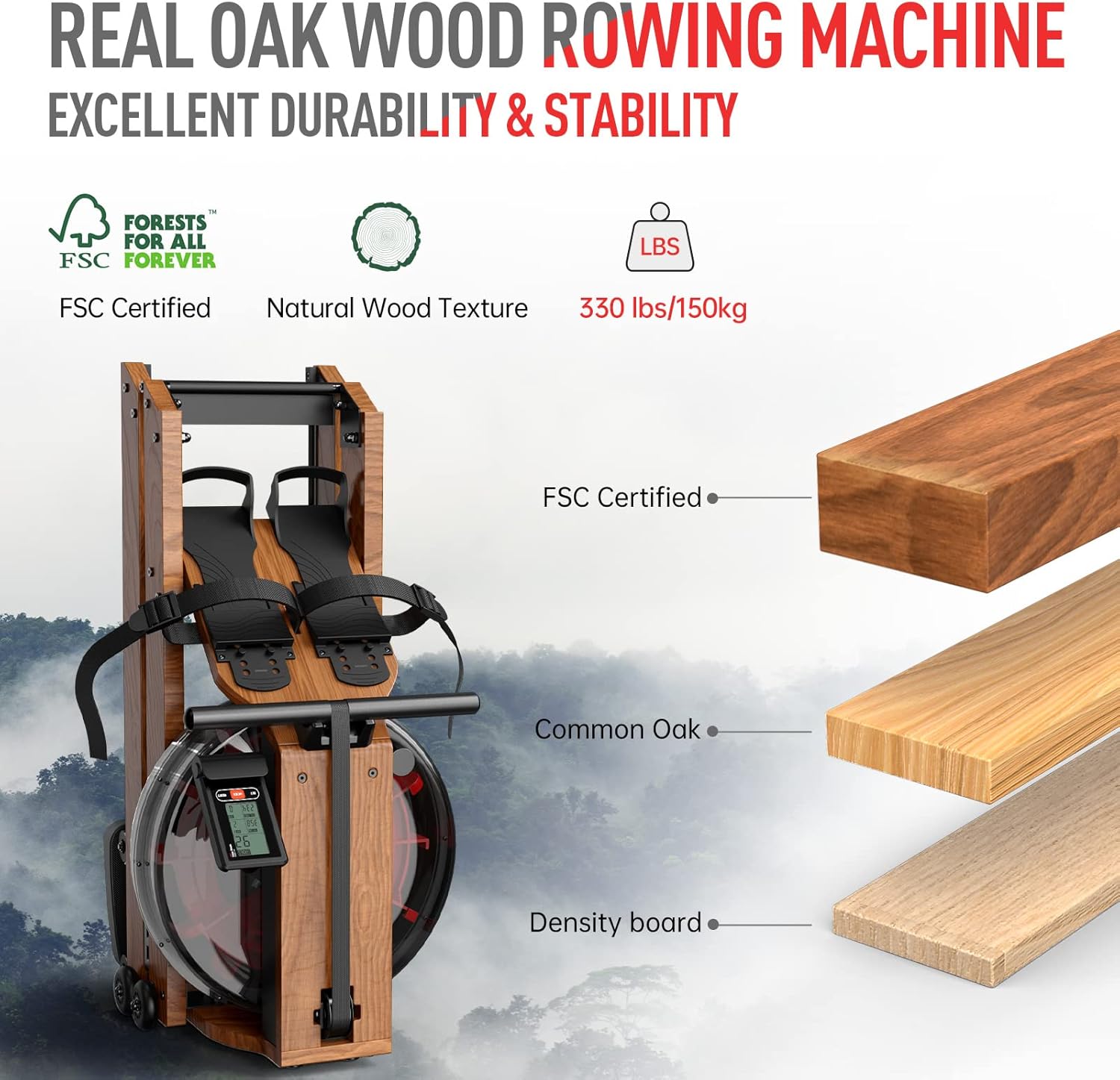 【Premium Solid Oak Build】JOROTO water rowing machines are made of FSC certified premium solid oak wood, which has excellent durability and stability to support 330lbs/150kg max load. User height up to 39”/195 cm.