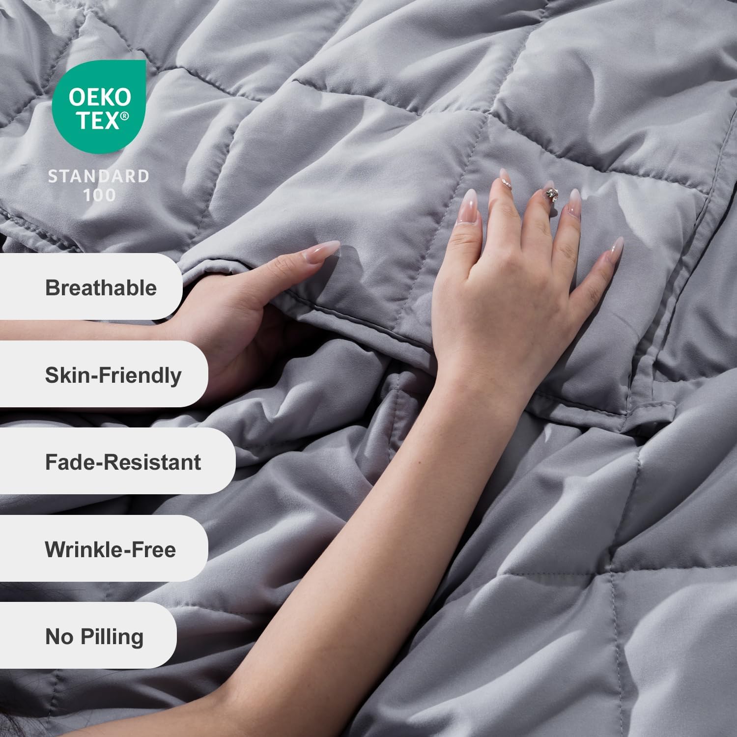 All-Season Comfort: The 15 lbs weighted blanket is made of breathable and soft microfiber fabric, keeping you cool in summer and cozy in winter. Certified by OEKO-TEX Standard 100, our weighted blankets are skin-friendly