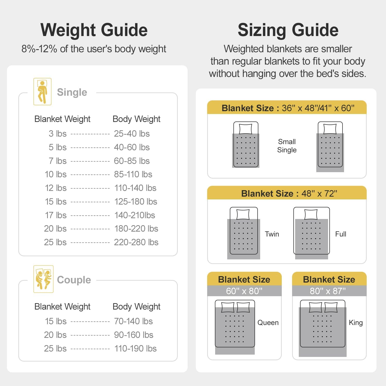 Sizing & Weight Guide: Please note that weighted blankets are sized to fit the mattress and will not hang over the sides to prevent slipping off. We recommend choosing a weighted blanket that is 8%-12% of the user’s body weight. For first-time users, start light and allow a few days to adjust