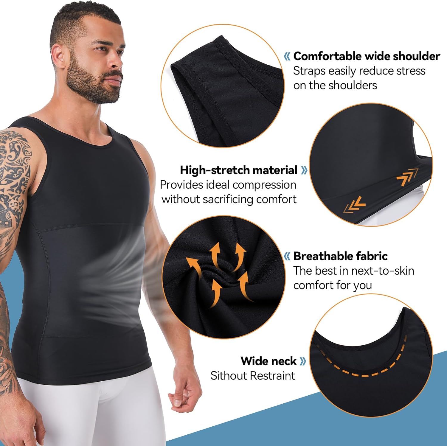 The compression tank top maximizes the shape of your chest, tummy, and sides. It is the ultimate chest binder and corset for men!