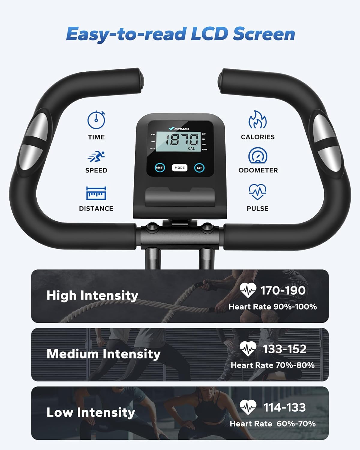 4 IN 1 Full Body Workout Bike: Transform your home workouts with the MERACH 4 in 1 folding exercise bike. Our 4-in-1 design offers upright and recumbent bike modes, arm and back exercises. With multiple fitness modes to choose, you can enjoy a customized workout targets every major muscle group in your body