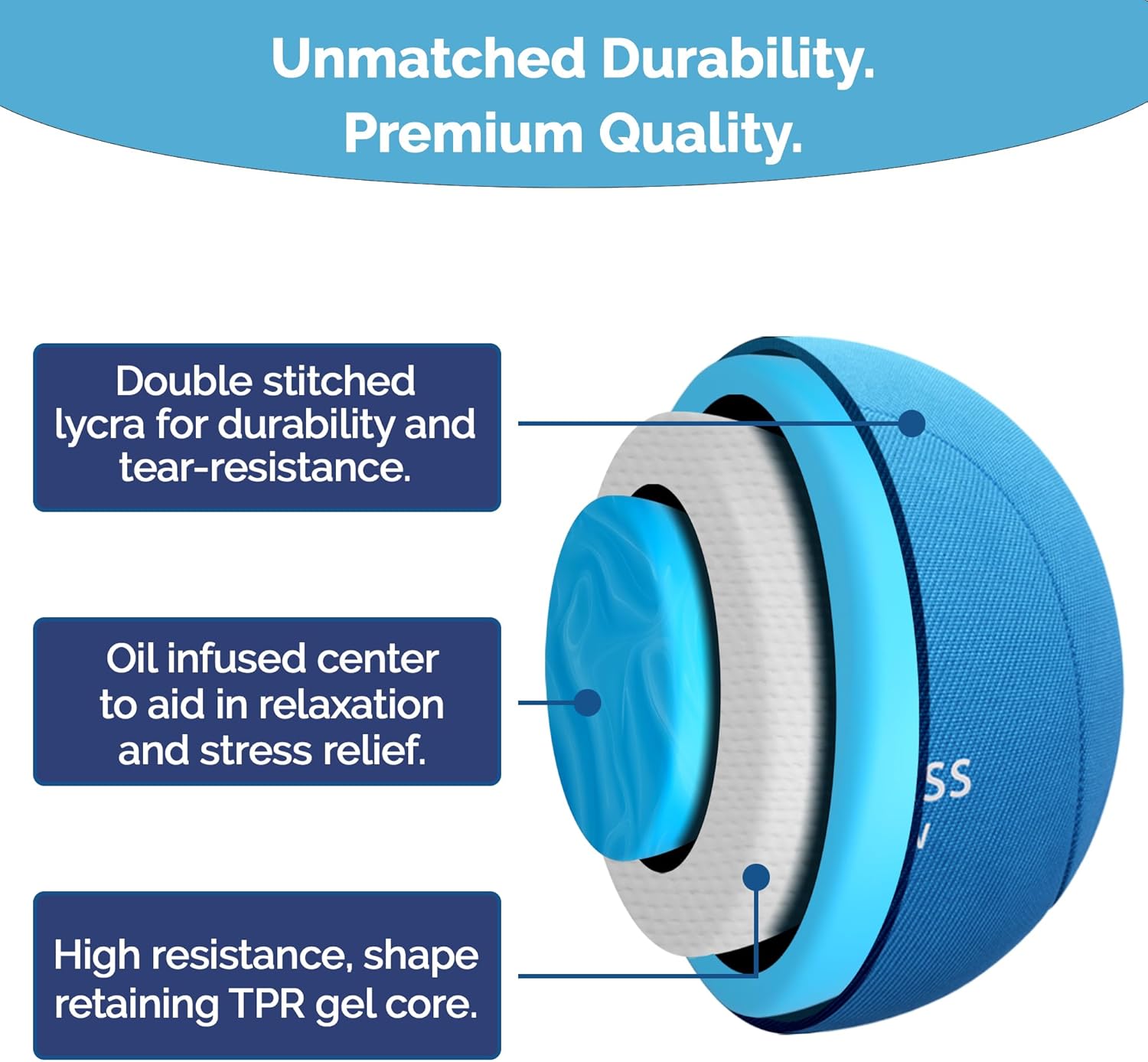 Premium quality, ultra durable, larger sizing- Our ergonomic stress relief ball is made of a tear resistant gel core and sleek non-slip and non-stock fabric. Our inner core gel is oil infused with stimulating scents to aid in mindfulness, relaxation and stress relief.