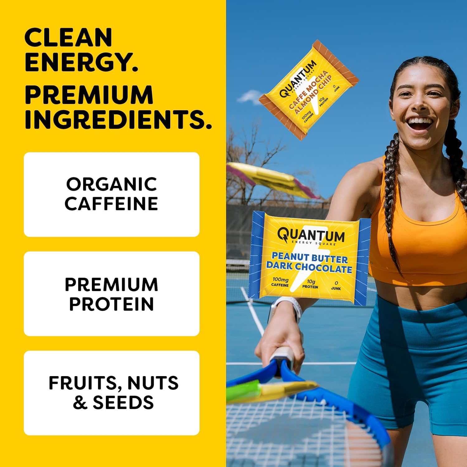 CAFFEINE x PROTEIN: Quantum delivers the lift of an energy drink plus the clean nutrition of a healthy snack in one tasty square.