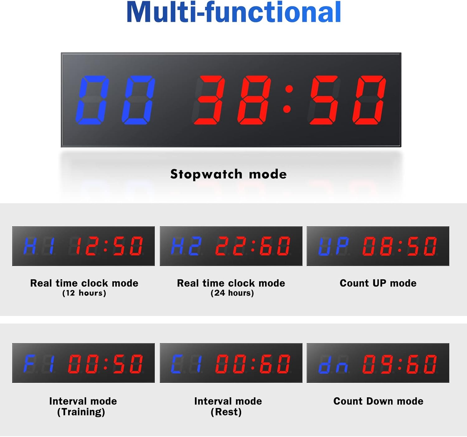 【Multi-Functional Gym Timer】 Versatile timer with plenty of practical functions: 12/24 hour normal time, countdown/countdown in minutes and seconds, stopwatch, Tabata, FGB, EMOM/Boxing/HIIT/MMA/UF. (Note: Not a wireless products, cannot be self-powered. Please use with power or portable power bank)
