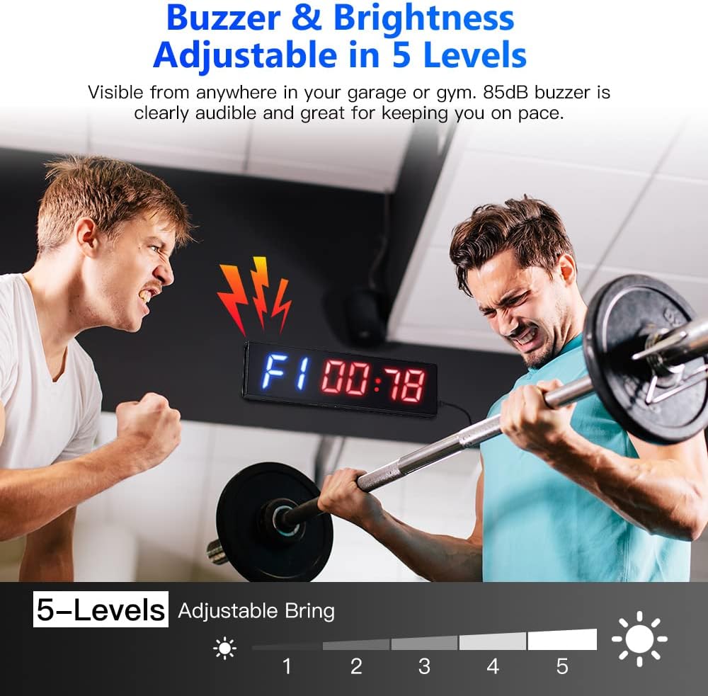 【Crystal Clear LED Display】 Features a 11’’ ultra-clear display with 1.5’’ LED digits in bright red and blue, brightness is adjustable in 5 levels(by remote controller), which are visible from anywhere in your garage or gym. The built-in 85dB buzzer is clearly audible (can be closed).