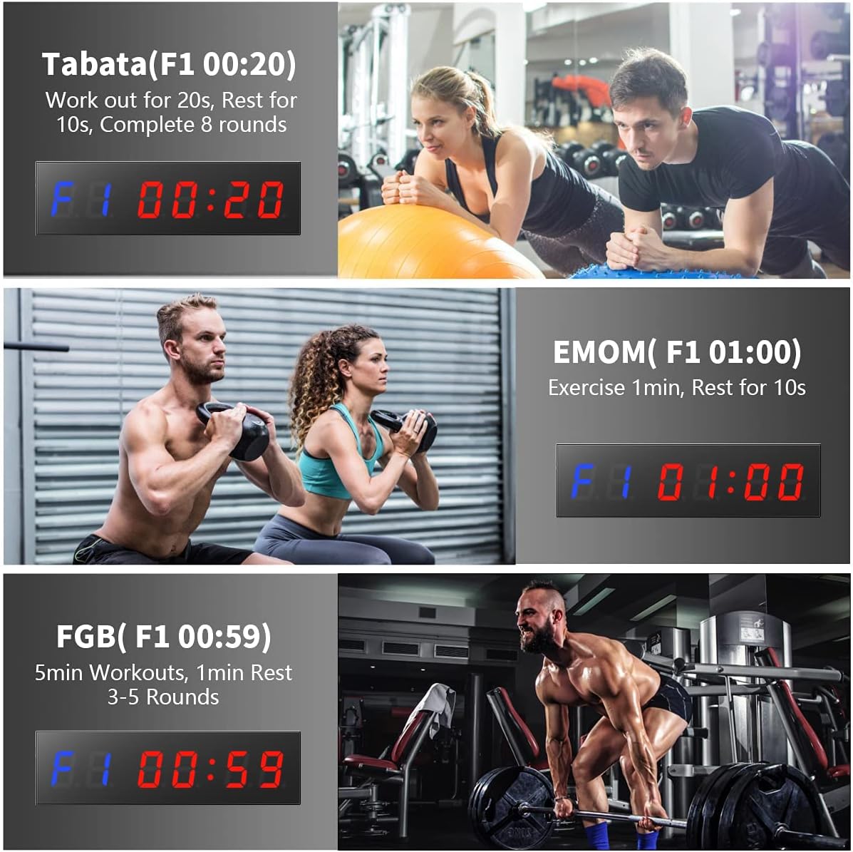 【Convenient Hotkeys】 The timer has pre-programmed buttons including TABATA and FGB for adding great conveniences to your training. ①TABATA: 8 rounds exercise 20 seconds, rest 10 seconds per round. ②FGB1: 5 rounds exercise for 5 minutes, 12 seconds rest each round. ③FGB2: 3 rounds exercise for 5 minutes, 20 seconds rest each round.