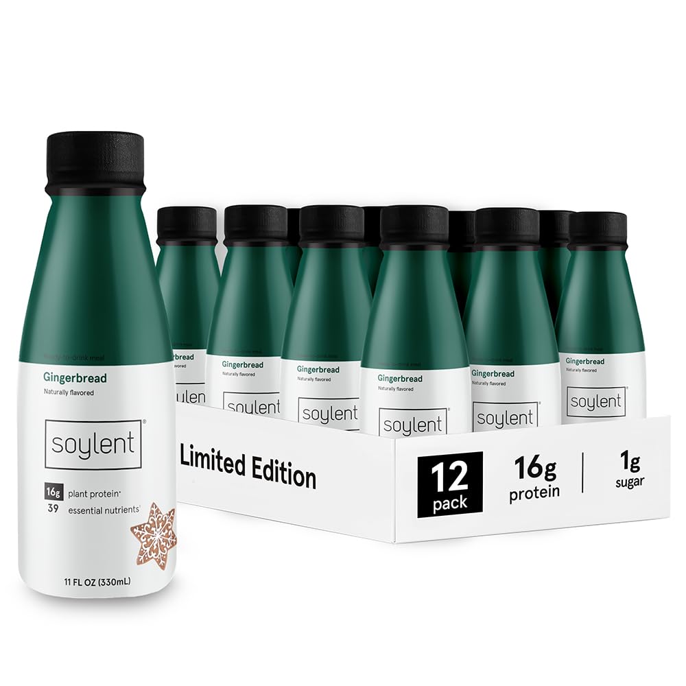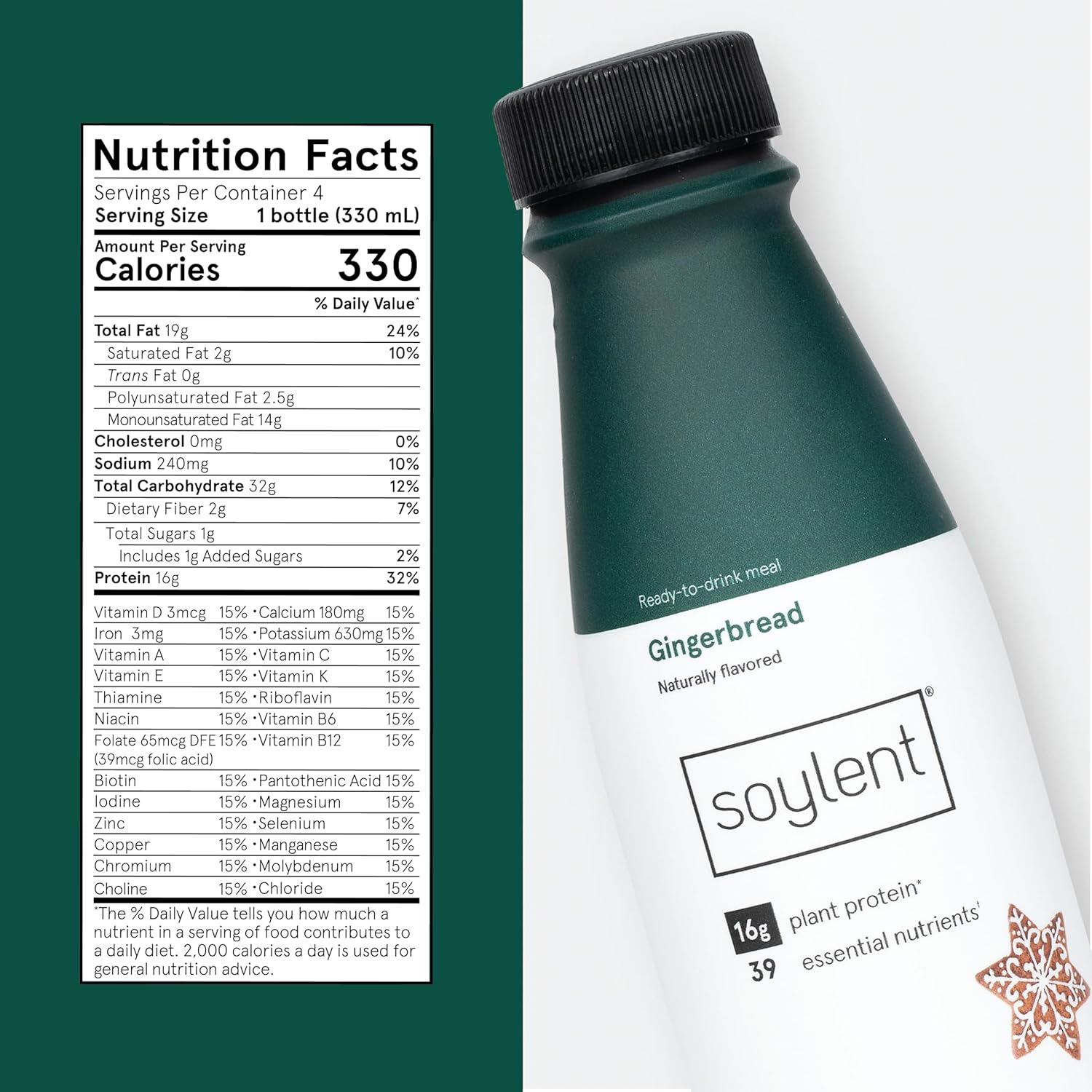 What to Expect: Contains 12 11oz Soylent Gingerbread ready-to-drink complete meal replacement shakes. Our 11oz meal shakes contain 320 caloires, 16g protein, and 1g sugar. Shelf stable. Refrigerate after opening.