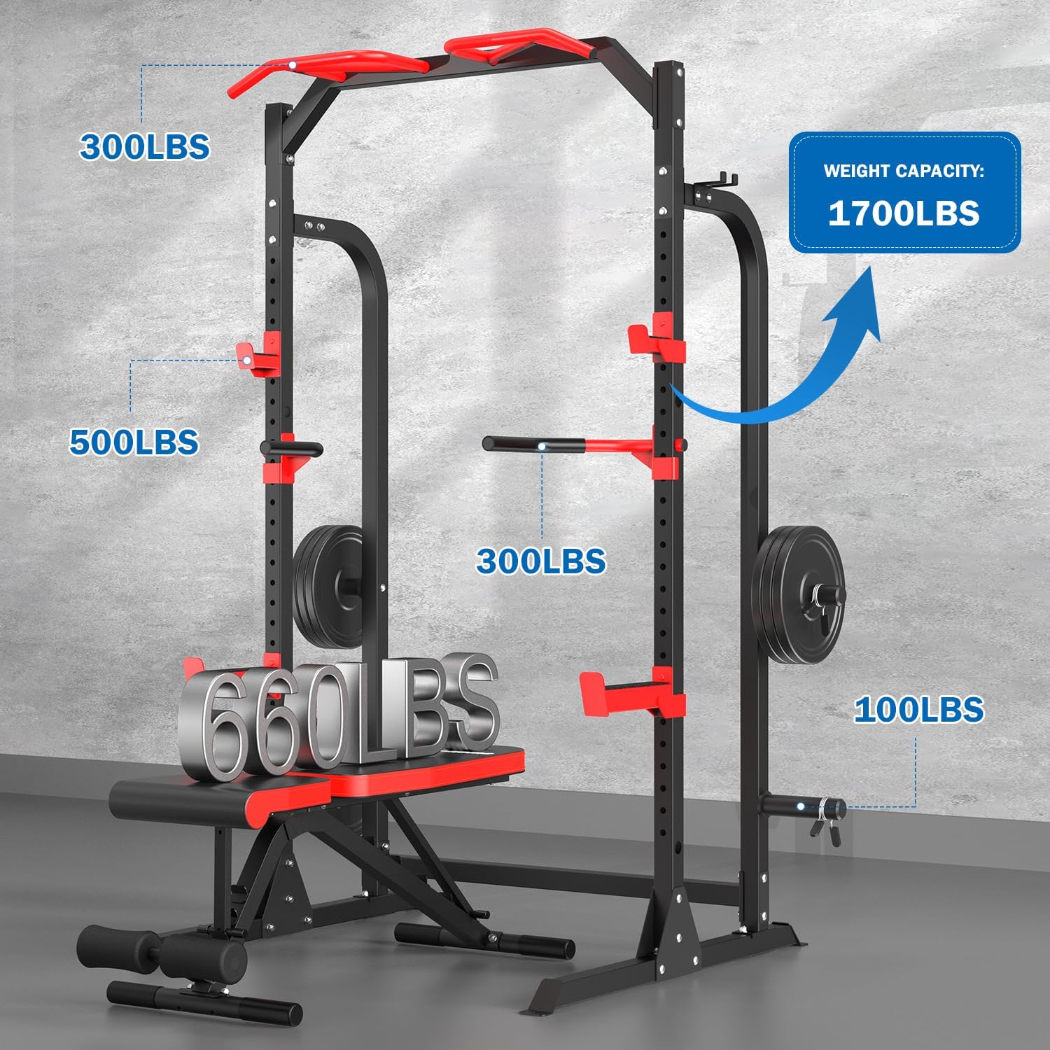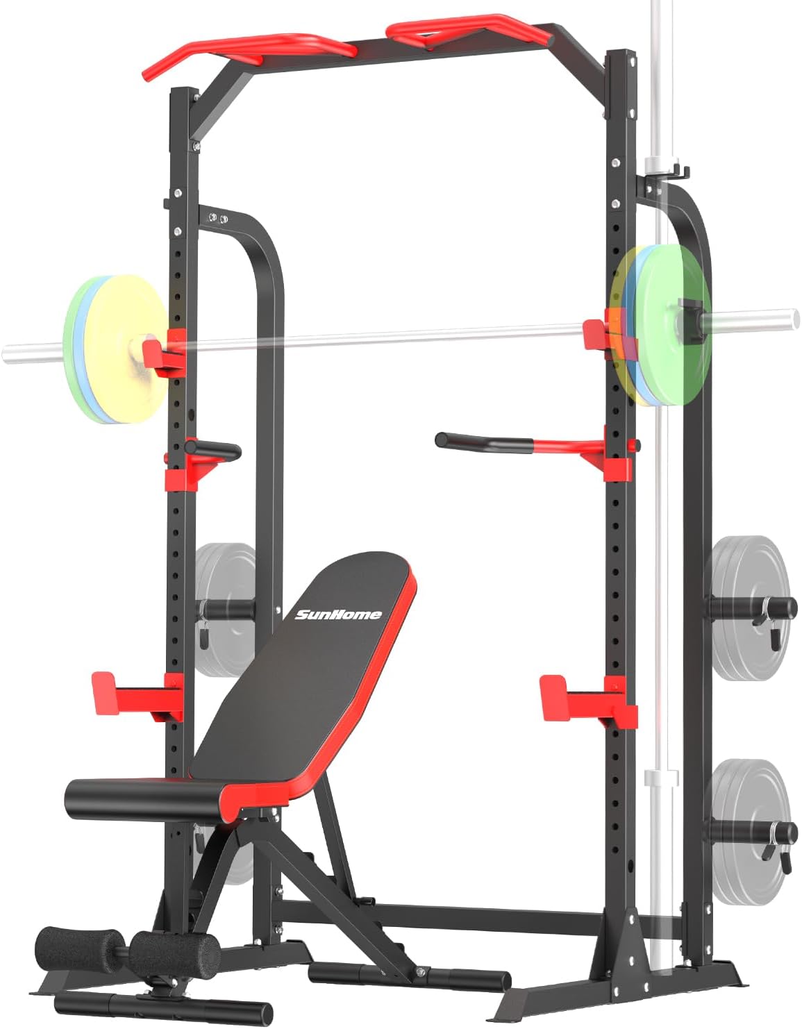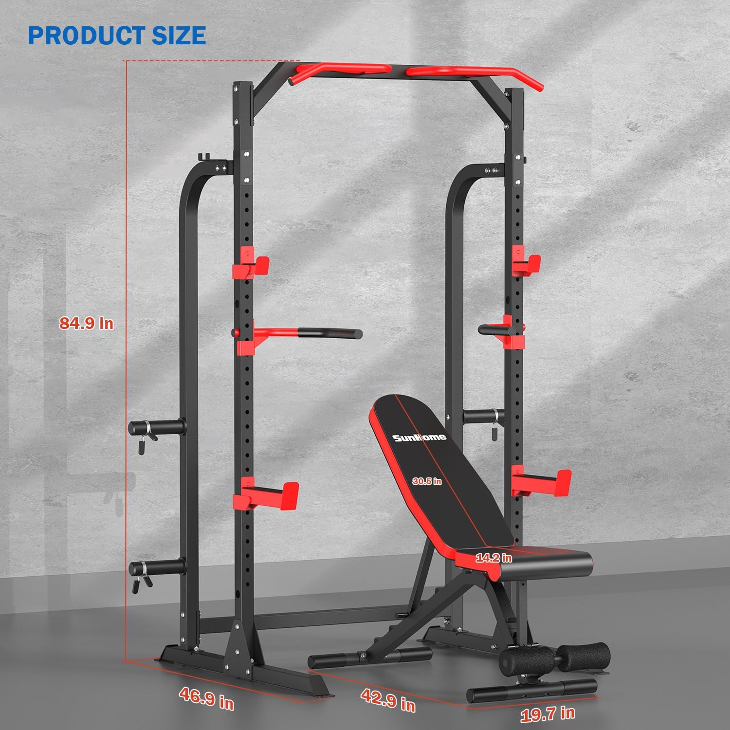 SunHome Power Cage Squat Rack with Bench, Multi-Functional Power Rack with J-Hooks, Dip Handles, Weight Plate and Olympic Bar Storage Home Gym
