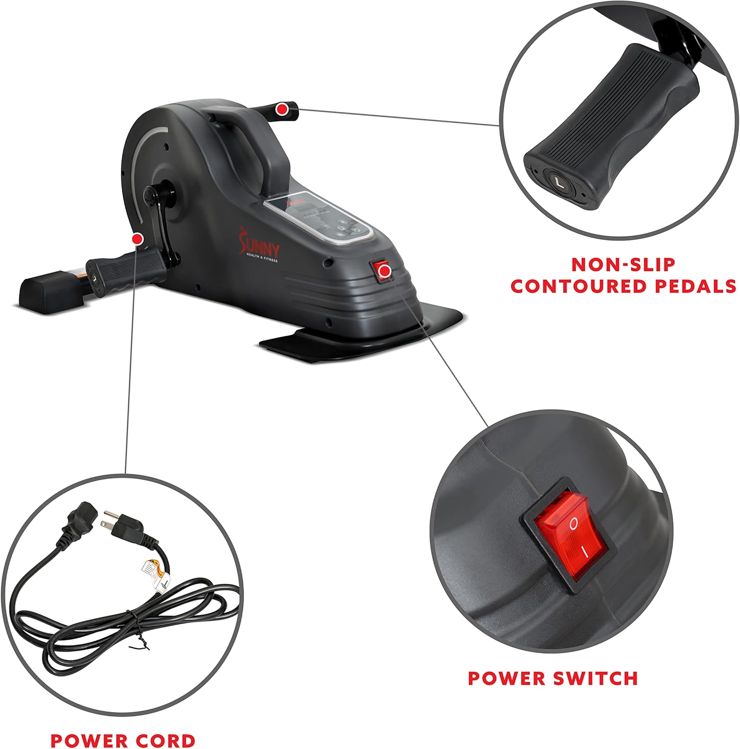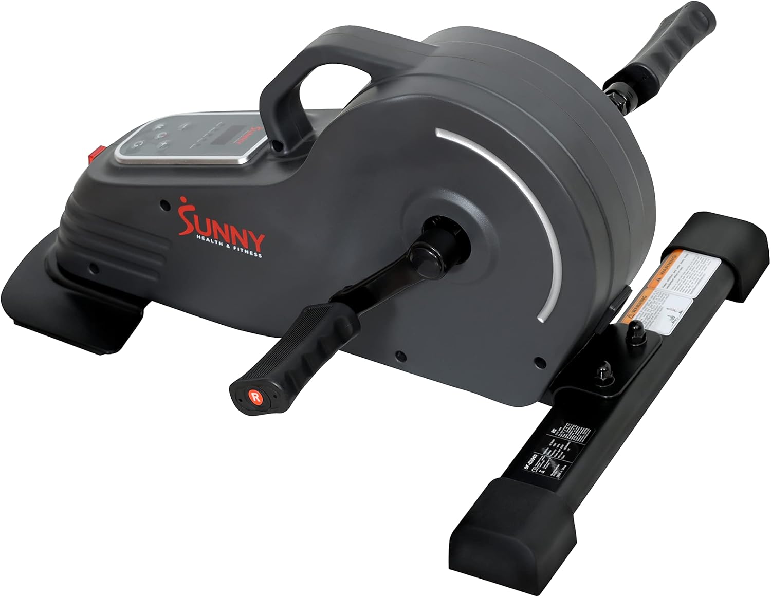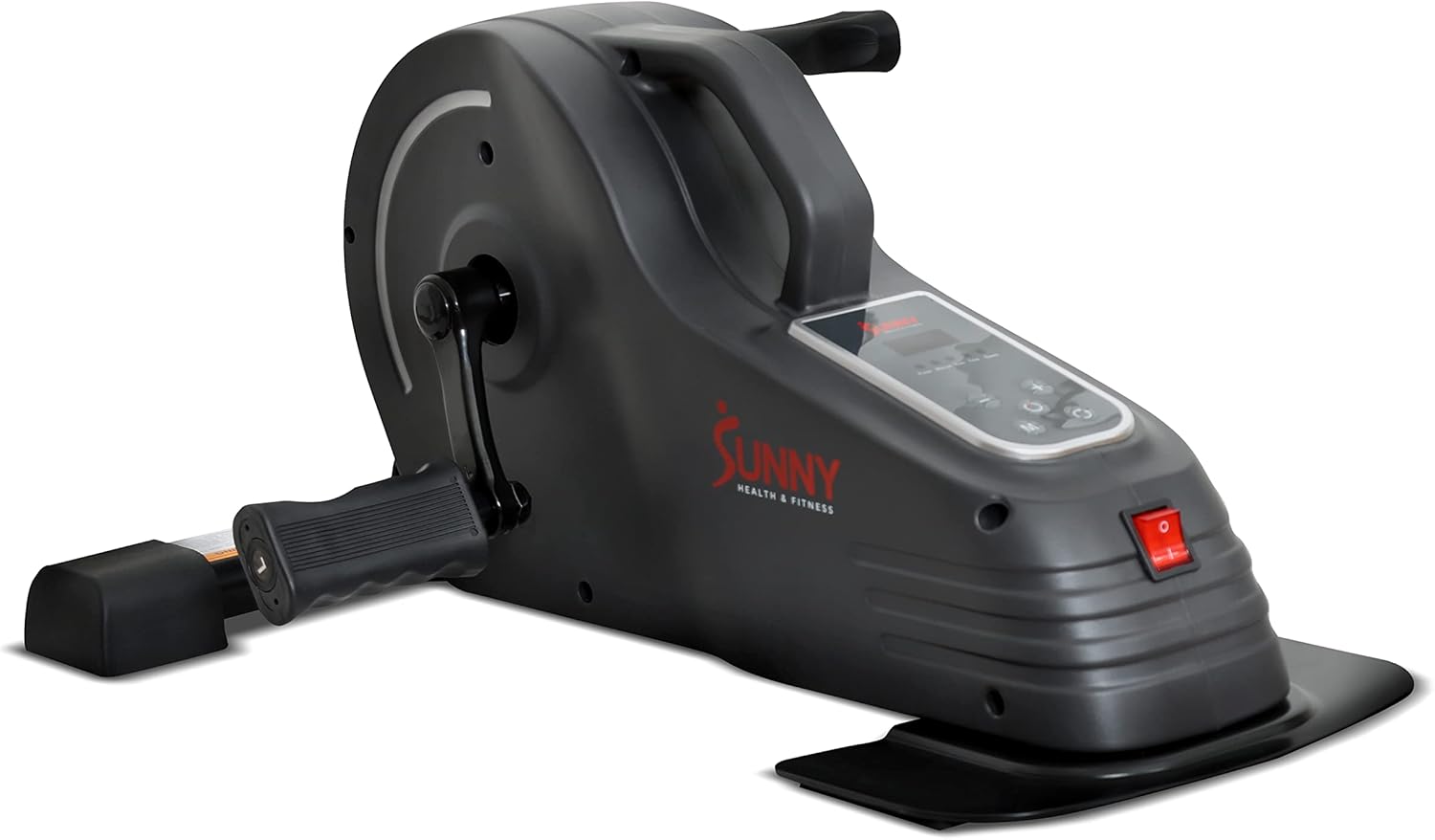 POWERED PEDALING: Fully electric and motorized, the underdesk minibike by Sunny Health & Fitness can operate at speeds of up to nearly 2 MPH and up to 90 RPM.