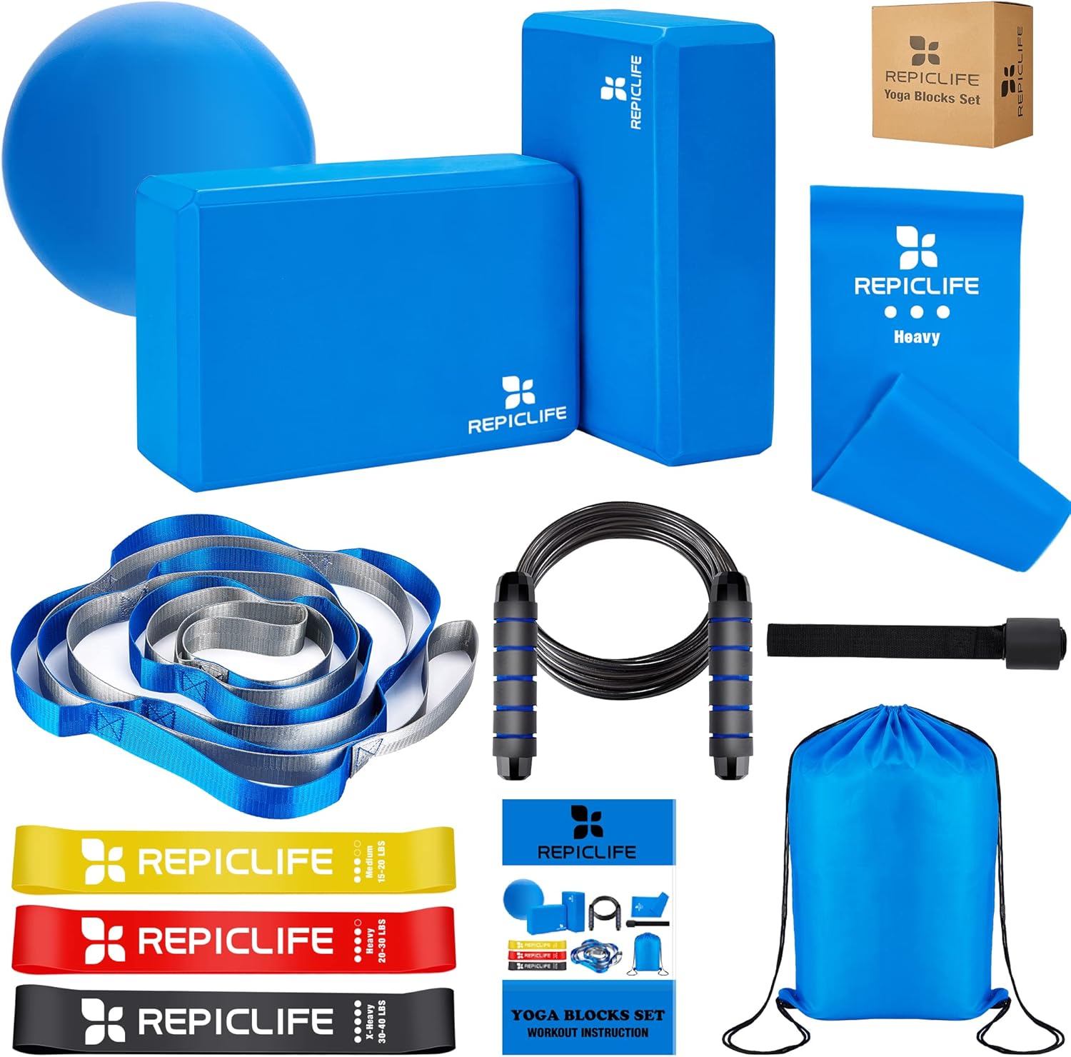 Yoga Blocks & Accessories Set – 2 Blocks, 1 Mini Ball, 3 Resistance Bands, 1 Door Anchor, 1 Jump Rope, Gym Bag & Manual for Yoga, Pilates & Stretching